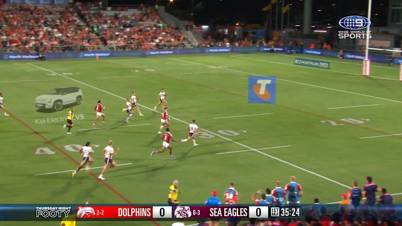 Dolphins centre Jake Averillo makes a long-range break but drops it before Manly’s tryline.