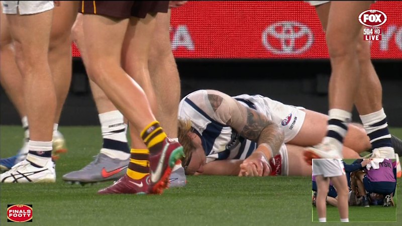 Geelong’s Tom Stewart stays down after a heavy tackle in the prelim final against Hawthorn. September 19, 2025 — 9.02pm