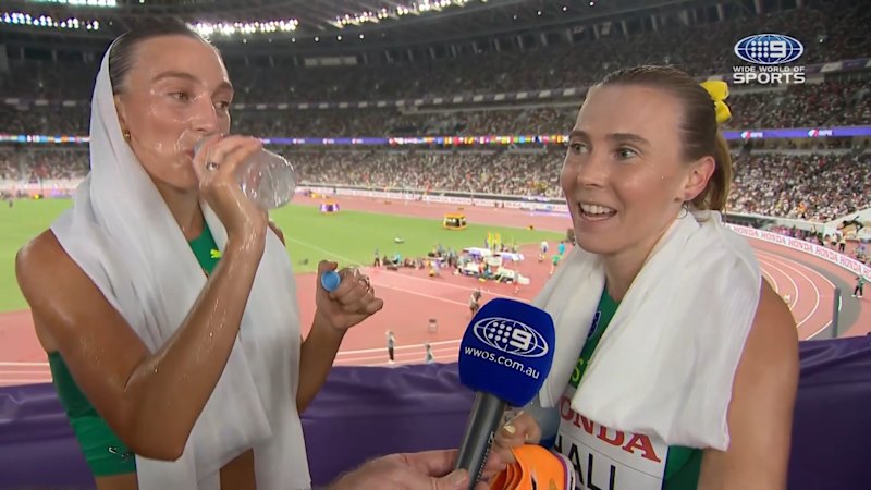 Rose Davies and Linden Hall talk to Nine’s David Culbert after running in their heat of the women’s 5000 metres. September 19, 2025 — 1.08am