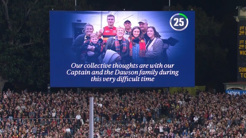 Jordan Dawson has teared up as the crowd paid tribute to his brother Jaryd, who died during the week.