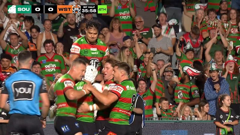 Jye Gray scored for the Rabbitohs in just the third minute of their clash against the Tigers in Gosford.