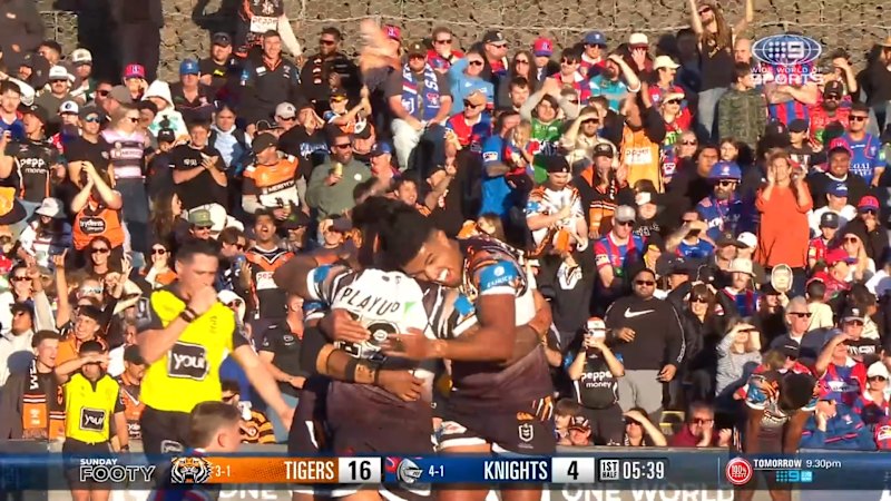 Patrick Herbert dummies past Fletcher Hunt to score for the Tigers.