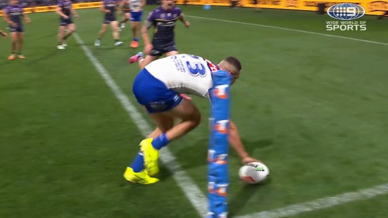 Jacob Kiraz sprints over the tryline to put the Bulldogs in front against the Storm.