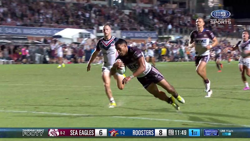 Share Facebook Twitter Pinterest Threads Bluesky Copy Link Tolutau Koula splits open the Roosters defence and runs the field for a brilliant try.