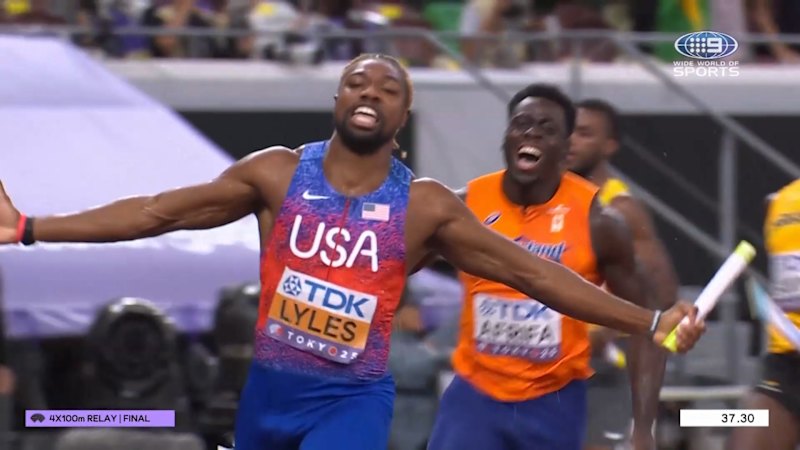 Noah Lyles brings home the gold medal for the USA in the men’s 4x100m relay while Australia fails to finish. September 21, 2025 — 10.38pm