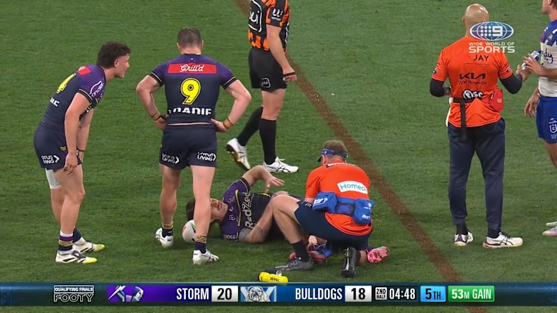 Share Facebook Twitter Pinterest Threads Bluesky Copy Link Cameron Munster gives his Melbourne teammates a fright as he goes down with a foot injury.