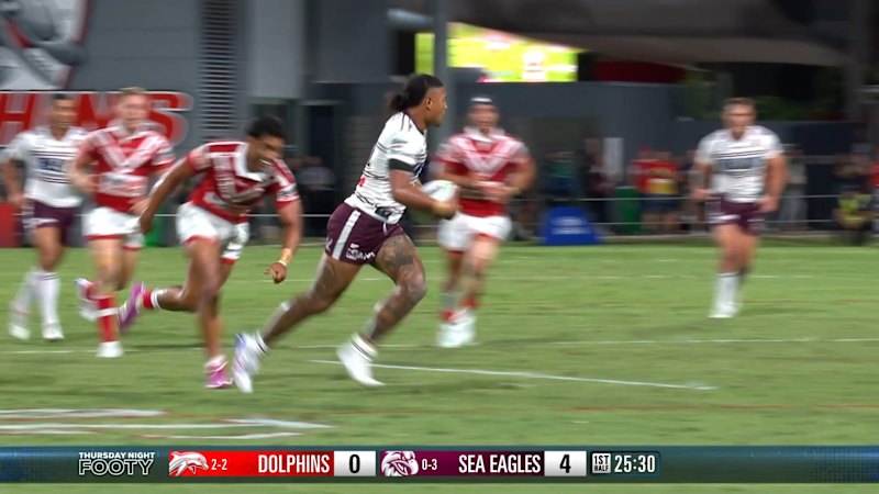Share Facebook Twitter Pinterest Threads Bluesky Copy Link Manly back-rower Haumole Olakau’atu bursts through and sets up a try for Tom Trbojevic.