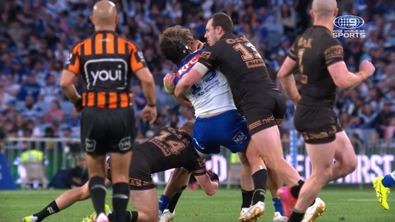 Brad Schneider is placed on report for a dangerous tackle on Bulldogs forward Sitili Tupouniua. September 21, 2025 — 7.02pm