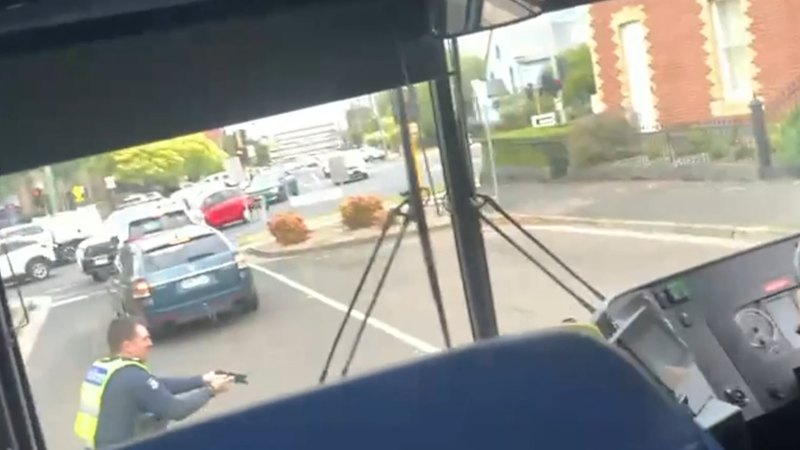 New vision shows the moment police fired at an allegedly stolen vehicle seconds after it reversed into a busload of terrified students in Geelong.