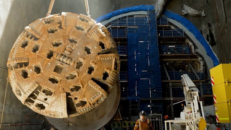 The cutter from a tunnel boring machine is removed from Westmead station and decommissioned.