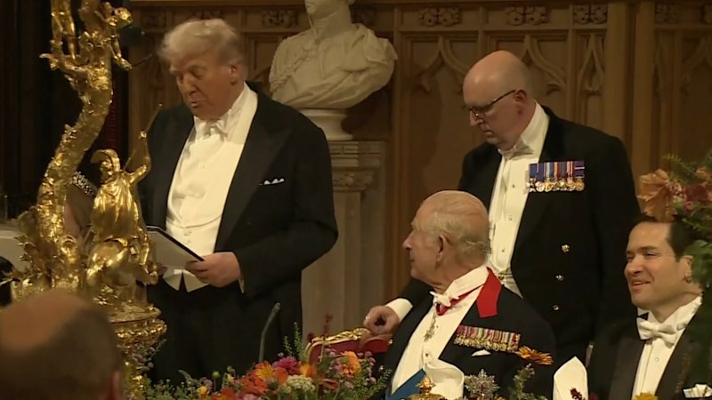 Share Facebook Twitter Pinterest Threads Bluesky Copy Link Video: Trump, Charles speak at state banquet in UK Trump, Charles speak at state banquet in UK We’re sorry, this feature is currently unavailable. We’re working to restore it. Please try again later. Dismiss Skip to sections navigationSkip to contentSkip to footer US President Donald Trump and King Charles have spoken at a lavish banquet for Trump’s state visit to the UK. September 18, 2025 — 8.12am
