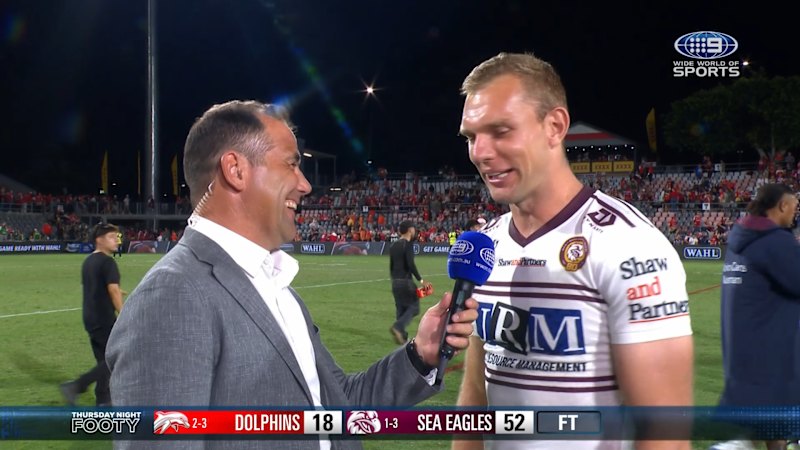 Manly skipper Tom Trbojevic speaks to Nine after his side’s win against the Dolphins.